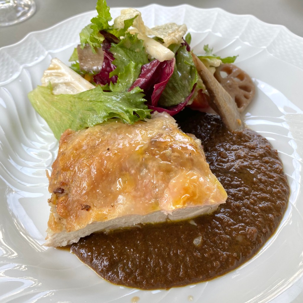 キヌアを詰めた鶏モモ肉のスパイスソース。ひらたく言えばチキンカレー。もっと言えばS嬢からのご予約は『サラダランチ』。