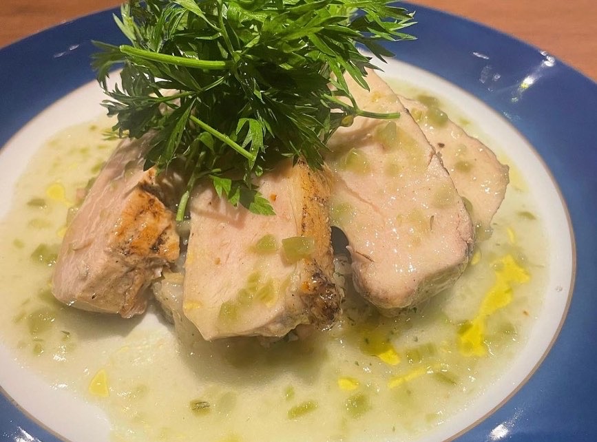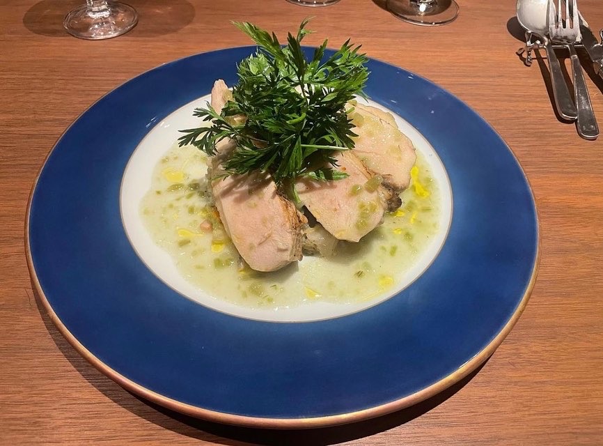 炭火で焼いた鶏の下には、鶏油のピラフがしいてあります。おそろしくシンプルがゆえ、とても難しい料理です。