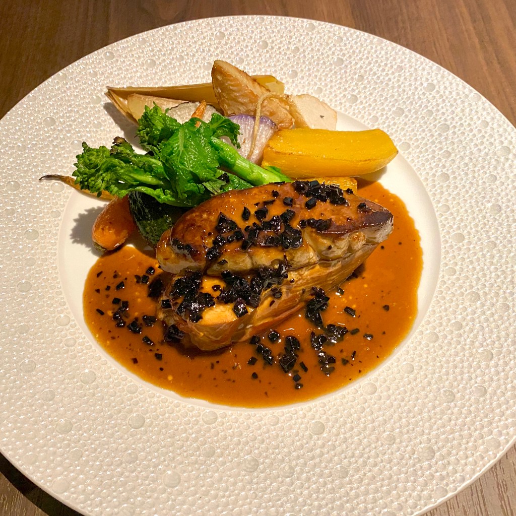 この日のランチコースのメイン。鶏胸肉の瞬間燻製とフォアグラのソテー マディラソース 旬野菜添え。