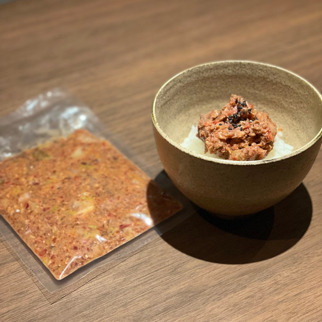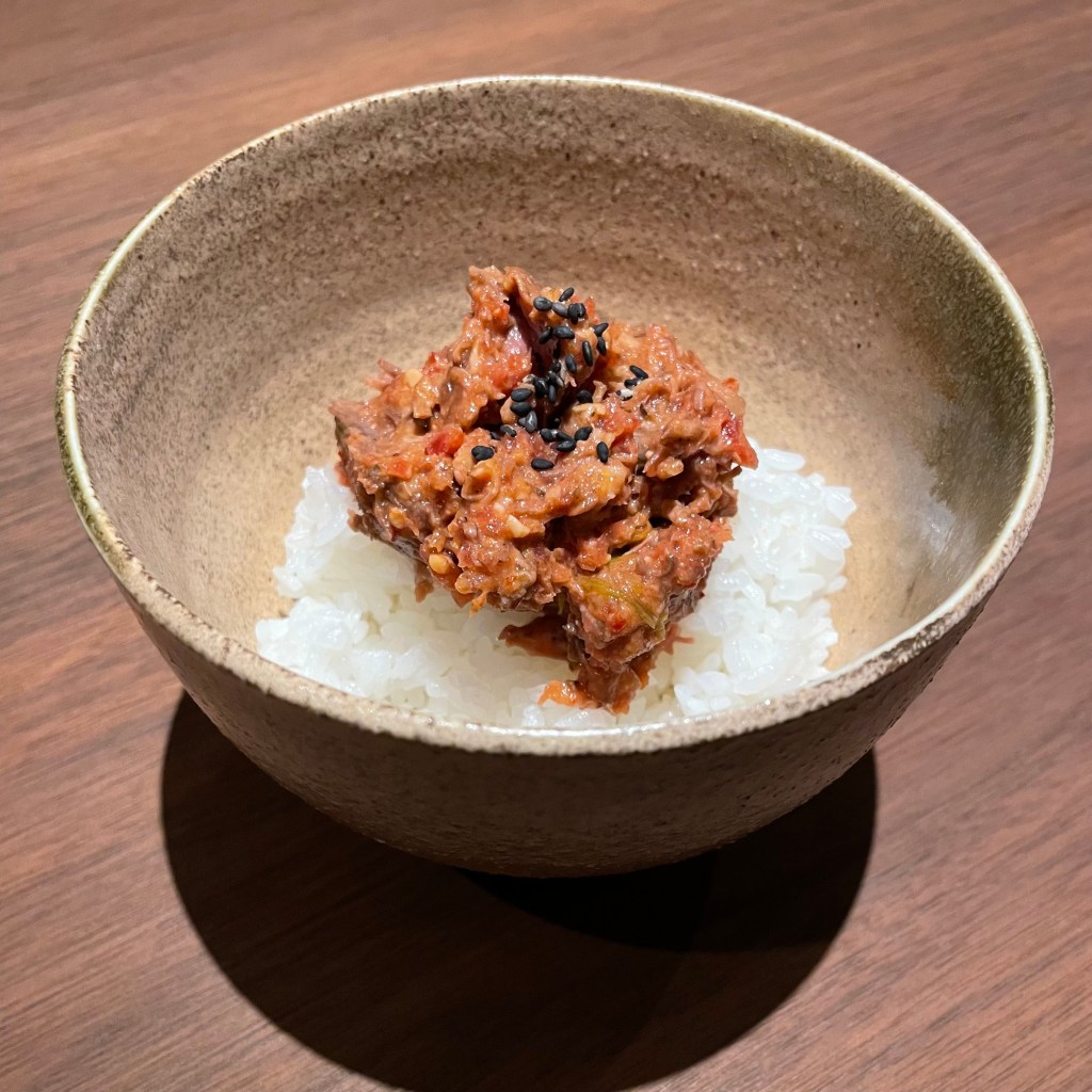 オニおろしでおろした大根と柑橘でジュレを作り、煮詰めたフュメに、ペーストした牡蠣を加えてコクを出し、裏ごししたものをマグロに塗って、提供します。
